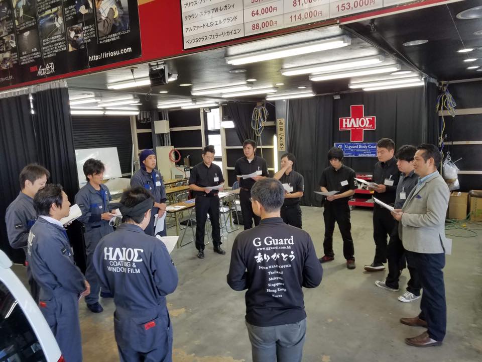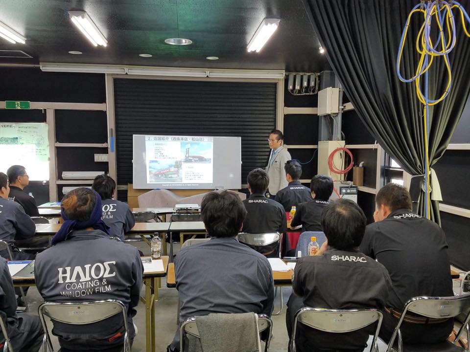 午前中は各店舗の朝礼を発表し合って、座学勉強会で車楽の会社案内や取り組み、そしてコーティングの基礎知識や、新商品の説明、スマホコーティングの体験などをしました。